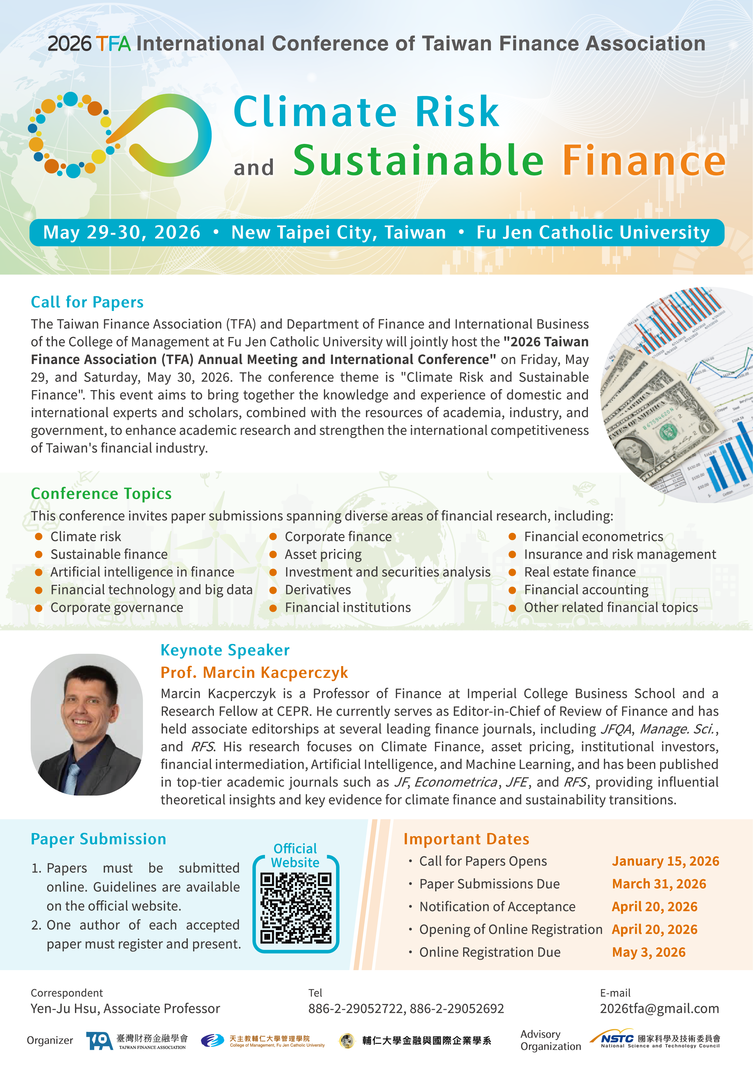 臺灣財務金融學會與天主教輔仁大學管理學院以及金融與國際企業學系將於2026年05月29日(五)及30日(六)舉辦「2026臺灣財務金融學會年會暨國際研討會」,以「氣候風險與永續金融」為大會主題。本次會議期望匯集國內外專家學者的知識與經驗結合產官學的能量,增強國內學術研究以及國內金融產業在國際上的競爭力,為健全國內財務金融制度與提升臺灣國際競爭力提出建議。